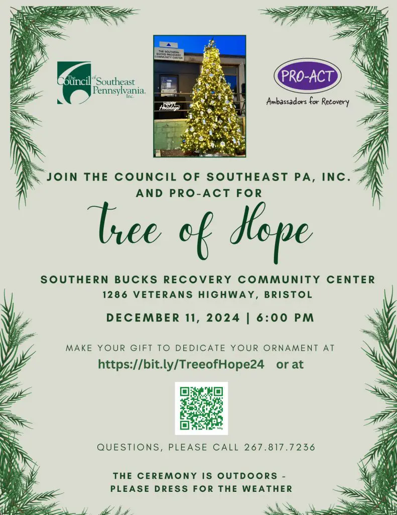Our community is invited to participate in this year’s Tree of Hope dedication ceremony, held once again outside at the Southern Bucks Recovery Community Center (SBRCC) Courtyard, 1286 Veterans Highway, Ste. D6, Bristol on Wednesday, December 11, 2024 at 6:00 pm. (Please dress for the weather!) We will celebrate those in recovery, remember those lost to the disease of addiction, and affirm those who serve as Rays of Hope to help others.